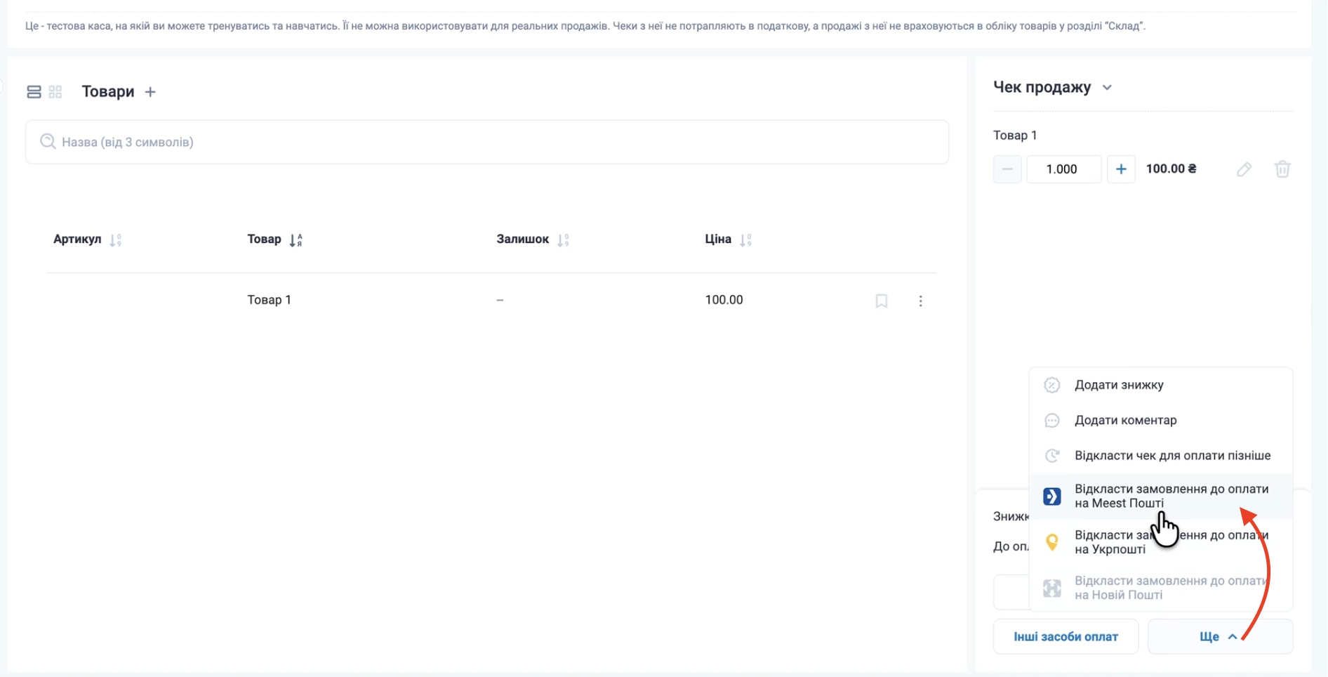 Створіть чек та натисніть на кнопку Ще, оберіть Відкласти чек до отримання та оплати товару Meest ПОШТА.