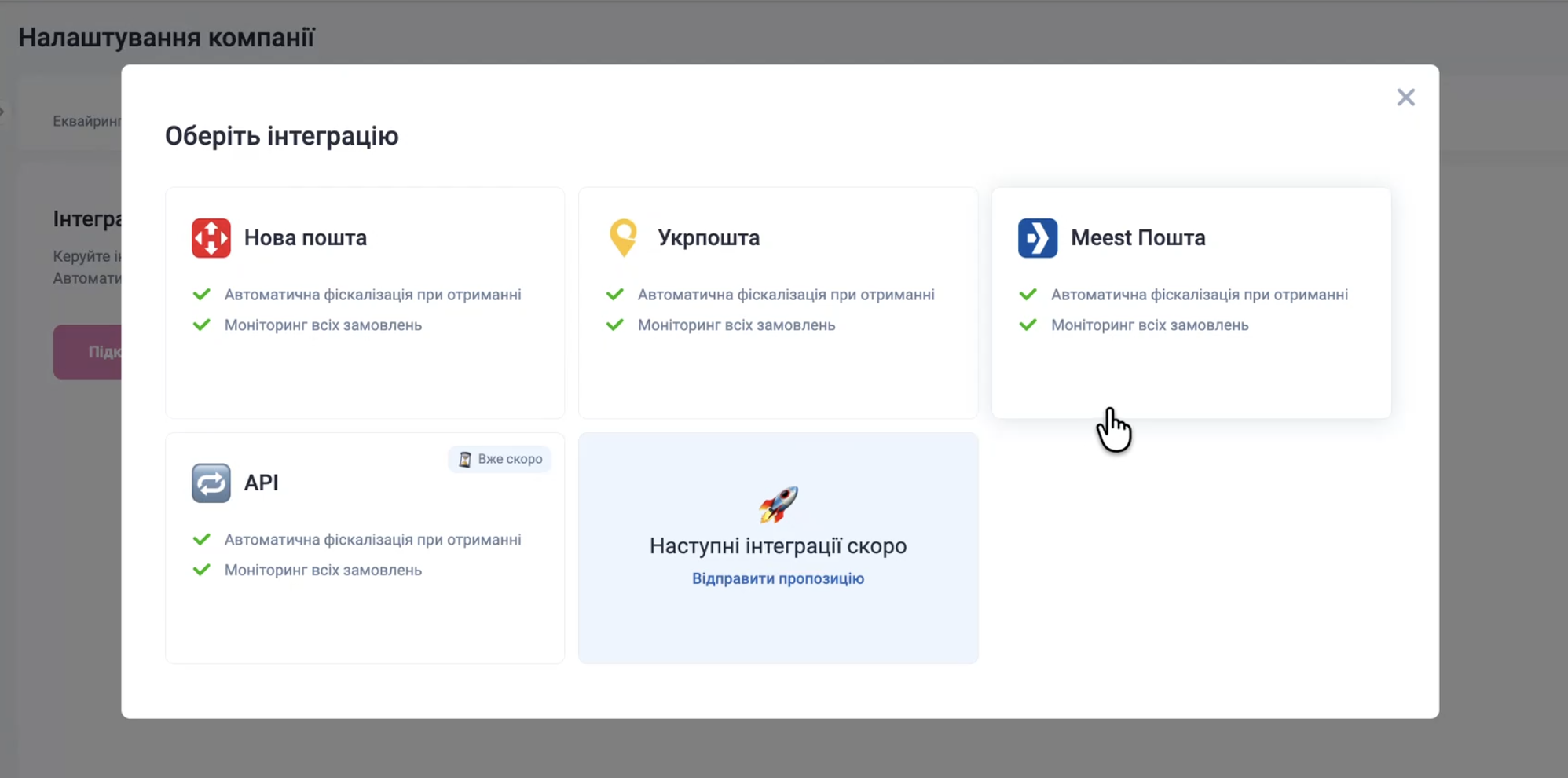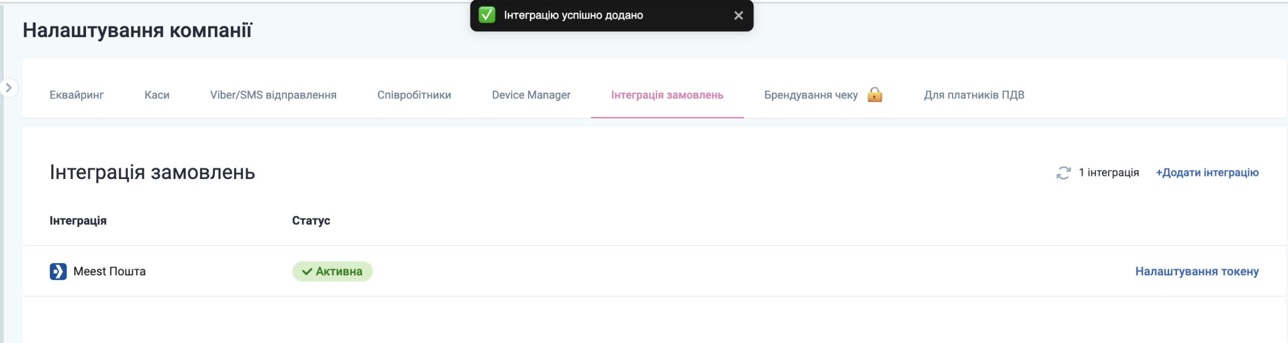 Обрати інтеграцію з Meest ПОШТА у переліку, після чого додати API токен кабінету Meest ПОШТА.
