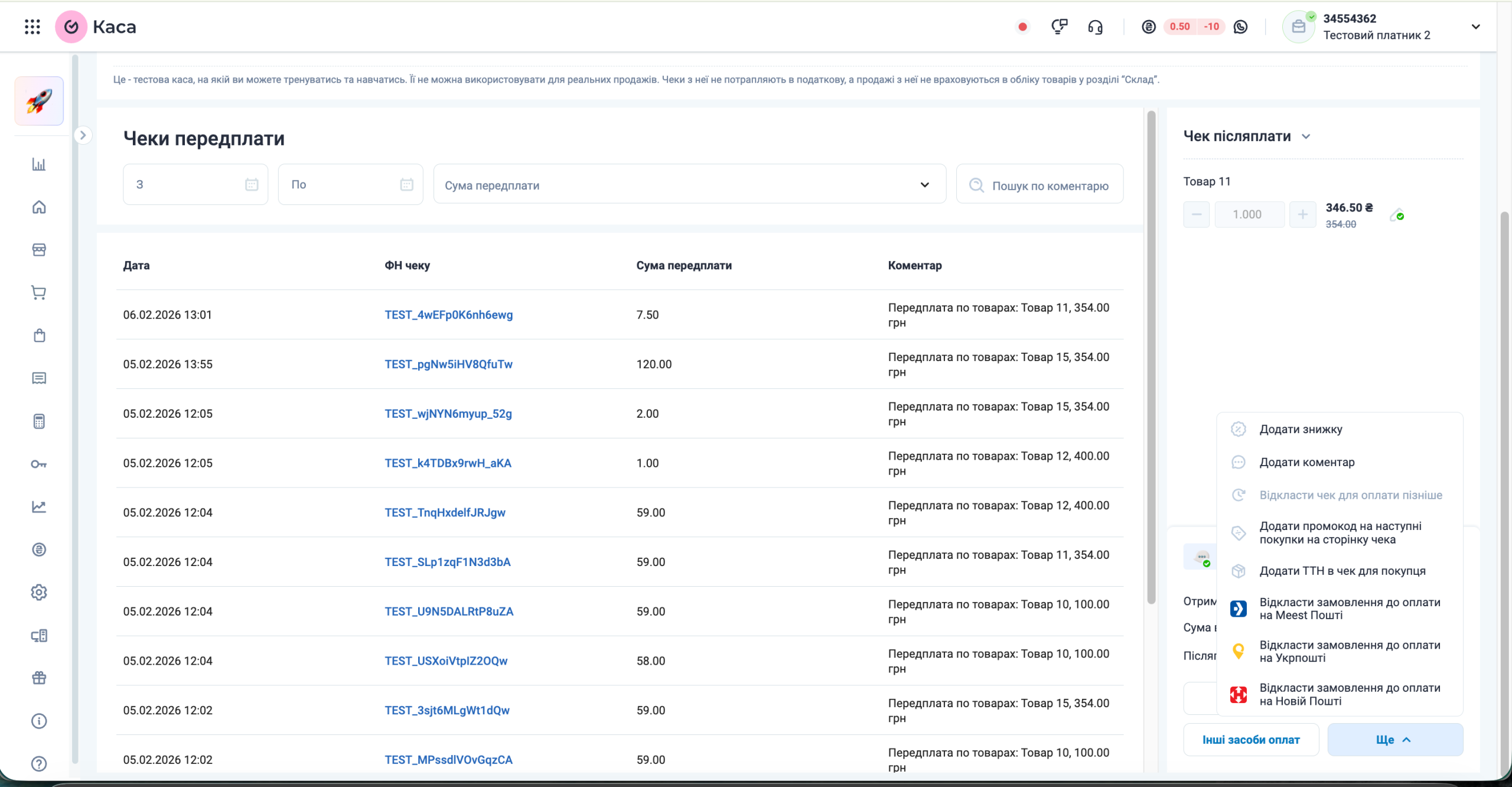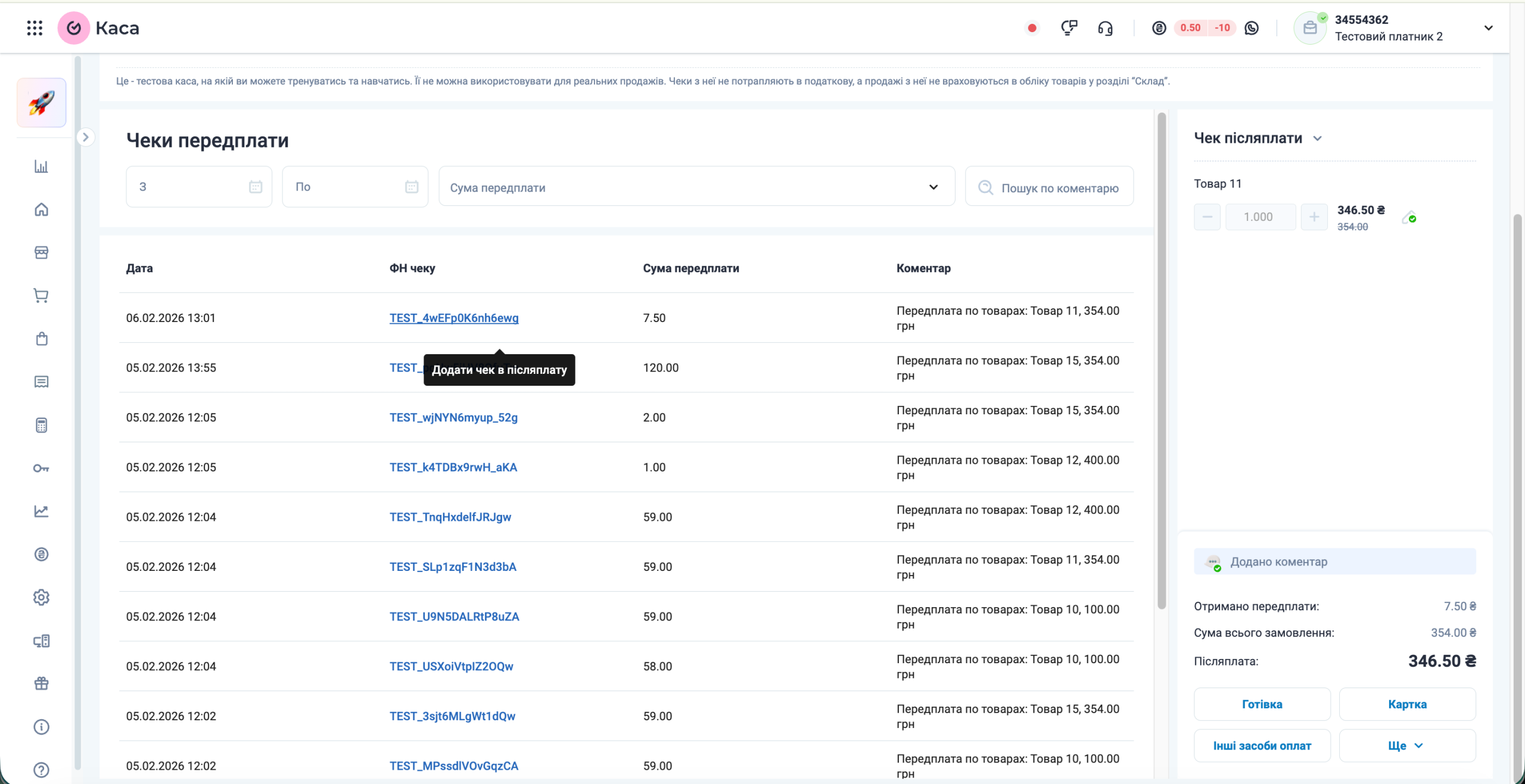 Створюється чек Післясплати з потрібною сумою доплати. Також додається автоматично коментар про чек передплати по певним товарам і їх ціна.