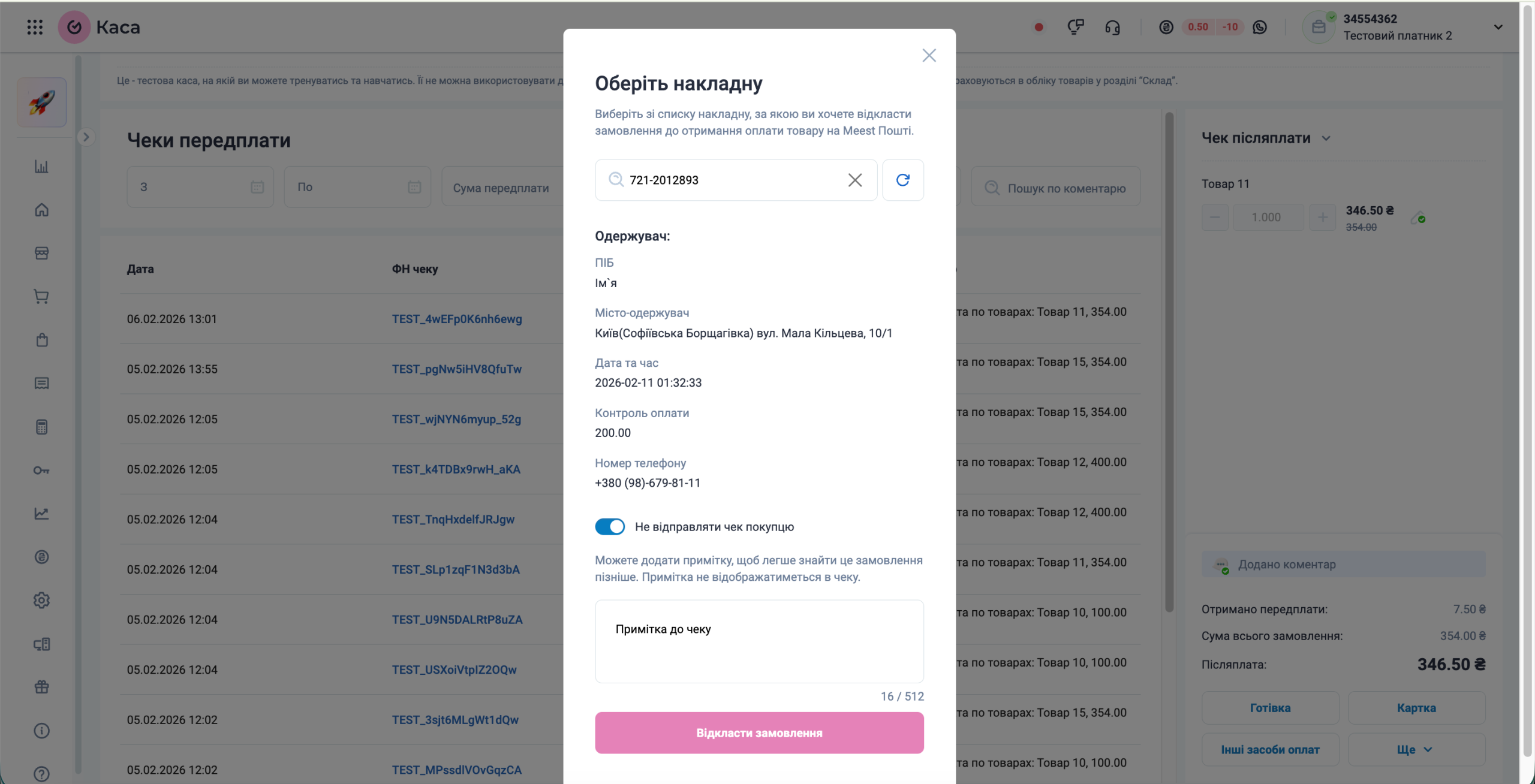 Натисніть «Відкласти замовлення». Після цього чек відобразиться у загальному списку чеків зі статусом відкладеного замовлення до моменту фактичної оплати покупцем.