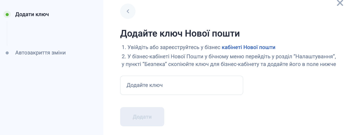 2. У бізнес-кабінеті Нової Пошти у бічному меню перейдіть у розділ “Налаштування”, у пункті “Безпека” скопіюйте ключ для бізнес-кабінету та додайте його в поле нижче