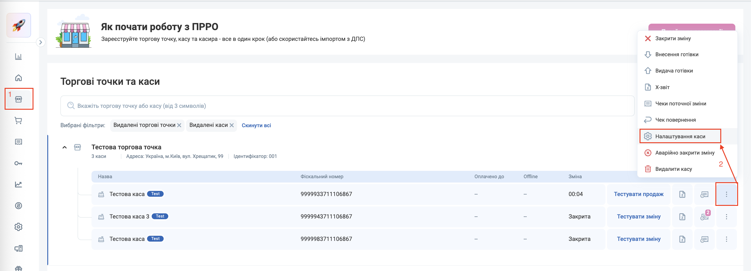 Для цього у розділі Торгові точки та каси поруч з потрібною касою натисніть на три краплинки й оберіть Налаштування Каси.