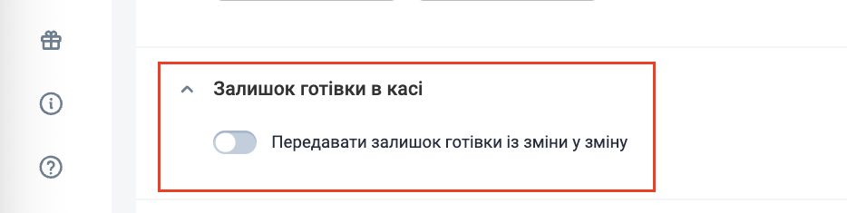 - Якщо ж ви фактично не виносите готівку з каси при закритті зміни, ви можете налаштувати перенесення готівки зі зміни в зміну, в тому разі наступна зміна цієї каси буде відкриватись з тією ж сумою, з якою була закрита попередня зміна.