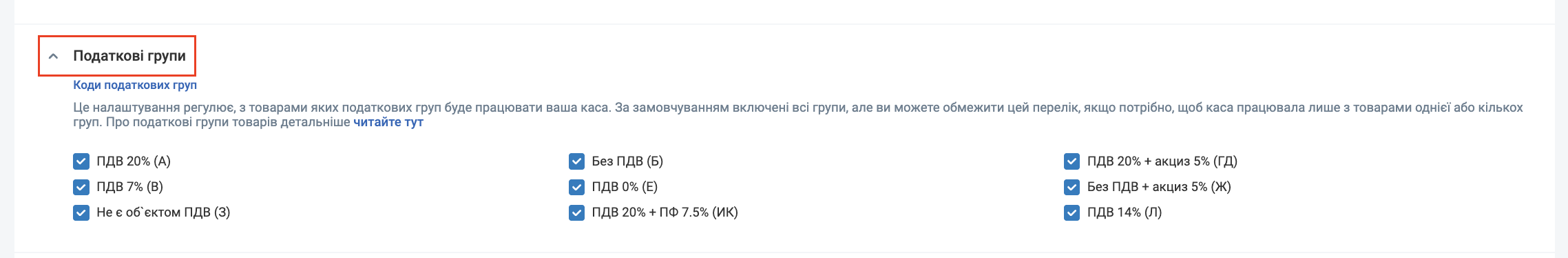 Це налаштуваннях регулює, з товарами яких податкових груп буде працювати ваша каса. За замовчуванням включені всі групи, але ви можете обмежити цей перелік, якщо потрібно, щоб каса працювала лише з товарами однієї або кількох груп. Про податкові групи товарів детальніше переглянути інформацію можливо у статті.