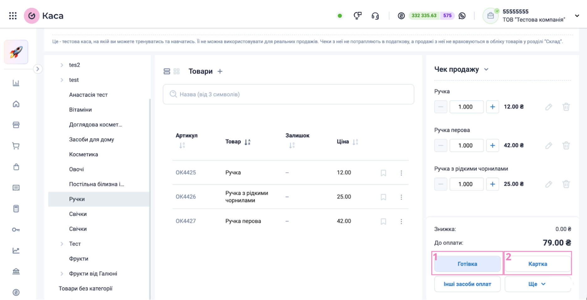 За замовчуванням у чеку доступні два види оплати: “Готівка” та “Картка”.