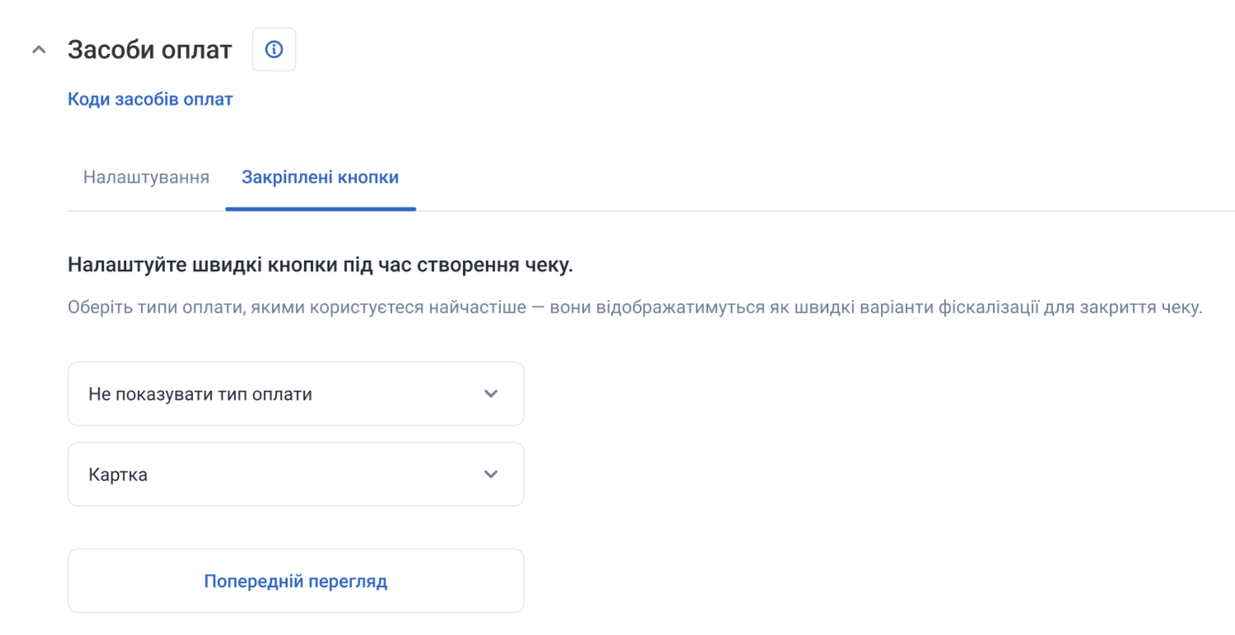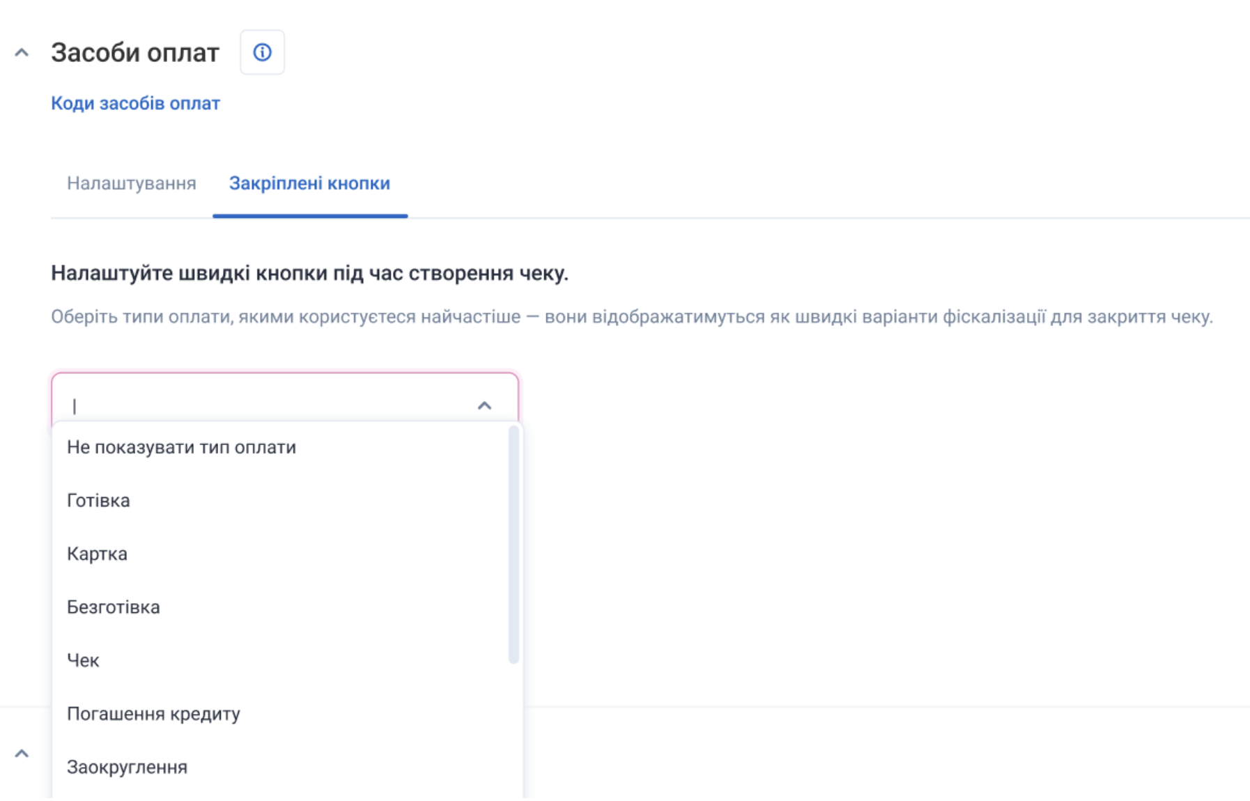 У вкладці “Закріплені кнопки” виберіть методи оплати, які касир бачитиме першими при створенні чека.