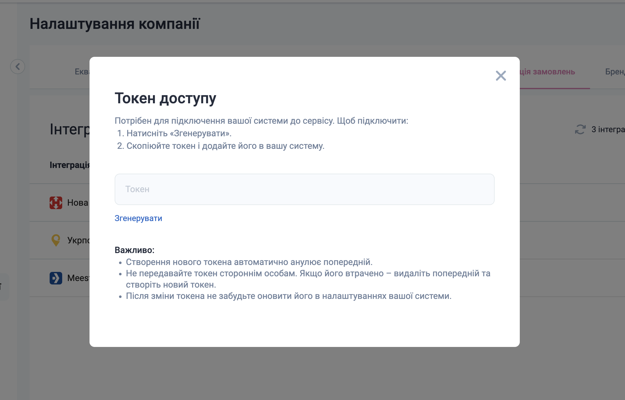 - Регенерація: Створення нового токена автоматично анулює попередній. Обов’язково оновіть токен у вашій системі після кожної зміни.
