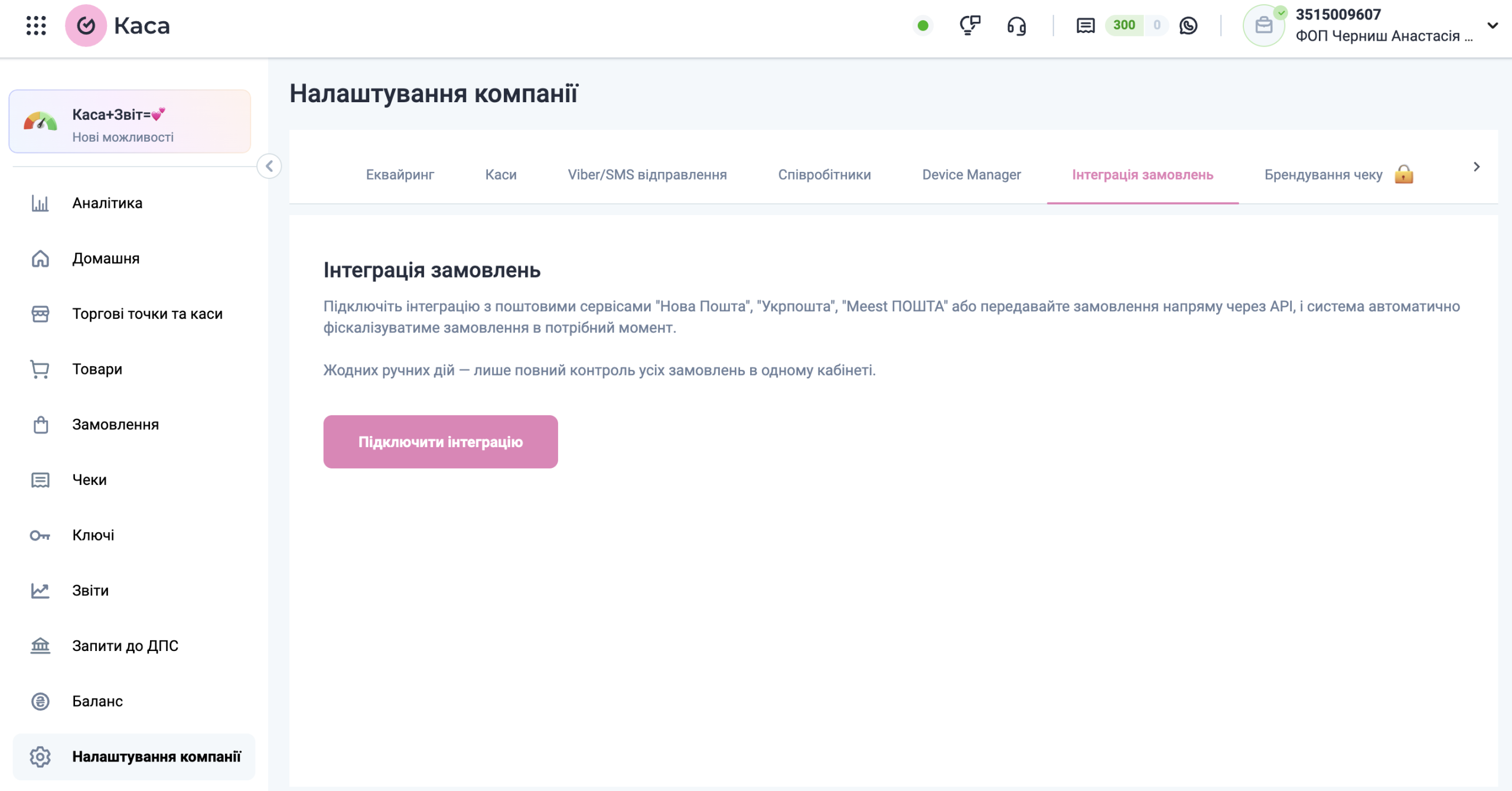 - Перейдіть у Налаштування компанії → Інтеграція замовлень.